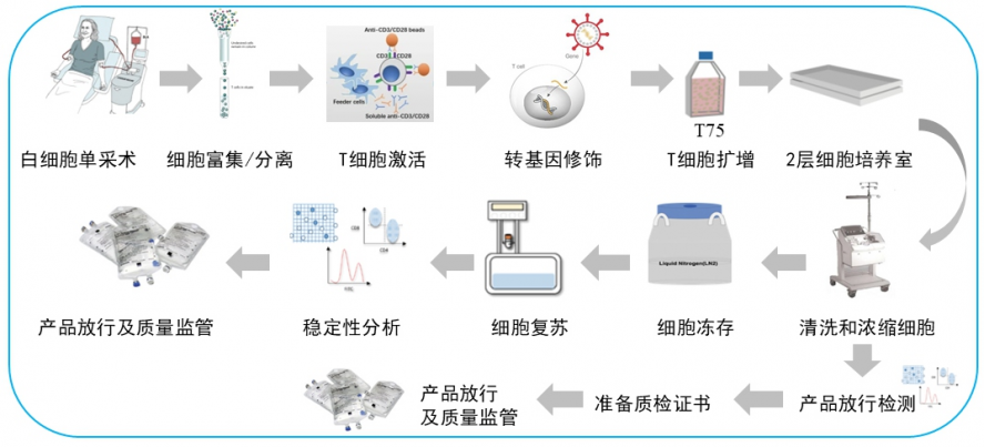 CAR-T 疗法是顺利获得病毒载体或电穿孔等基因⼯程技术将能够特异性识别肿瘤相关抗原并且能同时激活T细胞的嵌合抗原受体植⼊患者T淋巴细胞 ,将CAR-T 细胞经体外纯化 、扩增后再次回输 ,发挥CAR-T细胞抑制并杀伤肿瘤的一种免疫疗法。深圳细胞⾕可给予不同靶点的CAR-T 细胞的研发与外包⽣产服务。⽬前已成功运⽤⾃主⽣产的⼯业级逆转录病毒载体制备靶向CD19、 CD38、 BCMA-CD38双靶点等多款CAR-T 细胞 ,其转导效率均可达到70%以上 ,可完成从T淋巴细胞的采集、 肿瘤靶点病毒载体的转导、 CAR-T 细胞的扩增、 安全性检测到放⾏的全流程服务。⽬前已向华中科技⼤学协和深圳医院等定向给予GMP级CAR-T细胞⽣产服务。