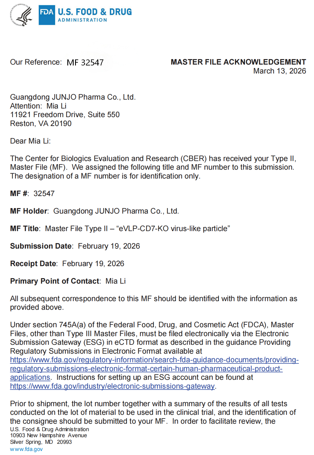 Recently, Cell Valley Group has achieved a significant milestone in the internationalization of core cell and gene therapy technologies. The group's wholly-owned subsidiary, Guangdong Junhou Biopharmaceutical Co., Ltd., has successfully completed the "eVLP-CD7-KO virus-like particle (CD7 gene knockout engineered virus-like particle)" filing with the U.S. Food and Drug Administration ( Drug Master File ( DMF ) under the reference number MF 32547, which has been officially accepted by the FDA's Center for Biologics uation and Research (CBER).