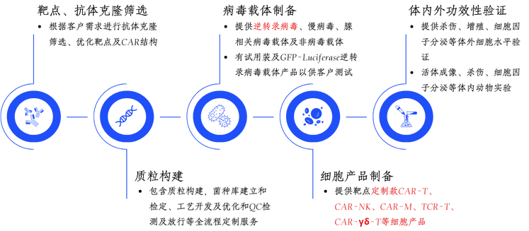 •  If commercialization of the resultsis required later,retroviral vectorsand cell products can beseamlessly integrated intoGMP-levelproduction servicesultra-low cost ; •  Retroviral vectorscan carrylarge target fragmentsup to 7kb ; •  ForNK cellsthat are difficult to infect withlentivirusesthe transduction efficiencyusingretroviralover 50%,with a viability rate of over 95%; •  A professional technical team providesfull-process technical supportto ensure the smooth progress of the project.