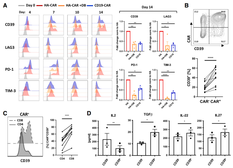 研究结果表明,CD39在功能失调的CD8+T细胞中高表达,其由CAR信号驱动,该亚群通常共表达CD73,顺利获得产生Ado来介导相关免疫抑制,表现为IL-2分泌水平降低,以及TGF-β等与T细胞抑制相关因子上升。研究人员顺利获得敲除CD39、CD73或A2aR,试图增强CAR-T细胞功能,但收效甚微。