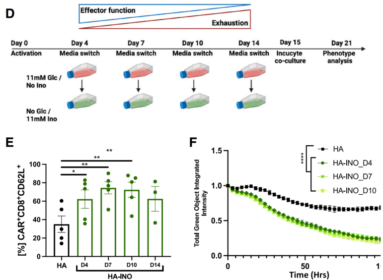最后,研究人员尝试了用含INO的培养基大规模生产临床级CAR-T细胞,发现INO组与对照组在转导效率、细胞活性和CD4/CD8比例方面均无显著差别,虽然细胞增殖受到一定抑制,但仍可满足临床要求,且幼稚T细胞和记忆T细胞的比例更高,分泌更多IL-2和IFN-γ,并且在小鼠体内表现出更强、更持久的抗肿瘤能力。