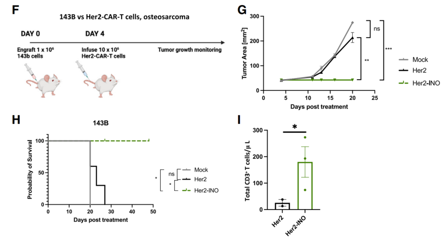 转录水平、蛋白水平和表观遗传学分析都证明,不同时间添加INO均增加了CD8+CD62L+细胞比例,增强细胞毒性,以及增加耗竭细胞的干性,并具有剂量依赖性。INO培养的CAR-T细胞在小鼠体内有更强的抗肿瘤能力,在接受Her2-INO-CAR-T治疗后17天检测,小鼠血液中T细胞数量是对照组的10倍。