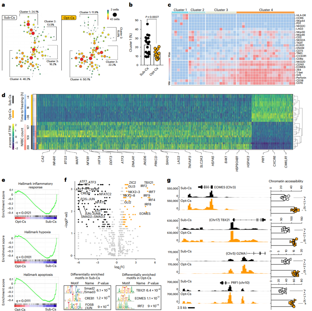除此之外,该研究还探究了脐带血单位(CBU)特征是否会影响患者的结果。结果显示,接受有核红细胞≤8×107的CBU的CAR-NK细胞,收集到冷冻保存时间≤24小时是取得优异结果的最重要预测因素。从这些最佳CBUs中提取的NK细胞具有高功能,并富含效应相关基因。相比之下,来自次优CBUs的NK细胞具有炎症,缺氧和细胞应激程序的上调。研究团队进一步在淋巴瘤、多发性骨髓瘤和卵巢癌三种肿瘤小鼠模型中证实了来自最佳CBU的CAR/IL-15 NK细胞具有更好的体内增殖能力,从而实现了更好的肿瘤控制。这些发现揭示了CAR-NK细胞生物学的新特征,并强调了异体细胞疗法中供体选择的重要性。
