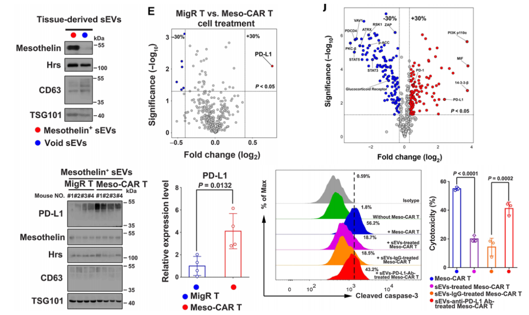 第一时间,作者利用小鼠脾T细胞,生成了靶向间皮素的Meso-CAR-T细胞,同时构建了小鼠肿瘤模型,并从肿瘤组织中纯化出小型细胞外囊泡。然后,作者使用基于抗体的定量蛋白质组学技术——逆相蛋白质阵列(RPPA)分析了其中蛋白质的表达。结果发现,在Meso-CAR-T细胞处理组中,PD-L1的水平明显更高。同时,RPPA分析发现CAR-T细胞中与T细胞活化相关的蛋白和T细胞存活相关的蛋白显著下调,而与T细胞衰竭相关的蛋白和调节性T细胞表达相关的蛋白被上调,这表明外泌体CAR-T细胞具有抑制作用。作者在此进一步的证明了外泌体CAR-T细胞毒性作用、增殖和功能的抑制作用。