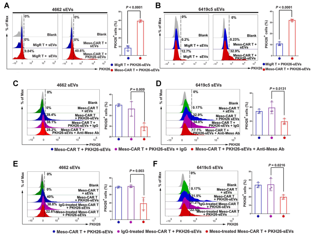 随后,作者研究了肿瘤抗原是否参与肿瘤源性外泌体CAR-T细胞的关联。结果发现,肿瘤源性外泌体与Meso-CAR-T细胞的结合水平明显高于对照,用抗间皮素抗体预处理外泌体可显著抑制其结合。这些数据表明,外泌体上的抗原与它们匹配的CAR相互作用,这使得外泌体CAR-T细胞优先结合。间皮素外泌体对Meso-CAR-T细胞的抑制作用明显更强,抗间皮素抗体显著减弱了外泌体对肿瘤杀伤、增殖和功能的抑制作用。总的来说,CAR-T靶向抗原介导的相互作用增强了外泌体对实体瘤中CAR-T细胞的抑制作用。体内实验也表明间皮素是肿瘤外泌体介导的Meso-CAR-T细胞体内抑制的关键所在。